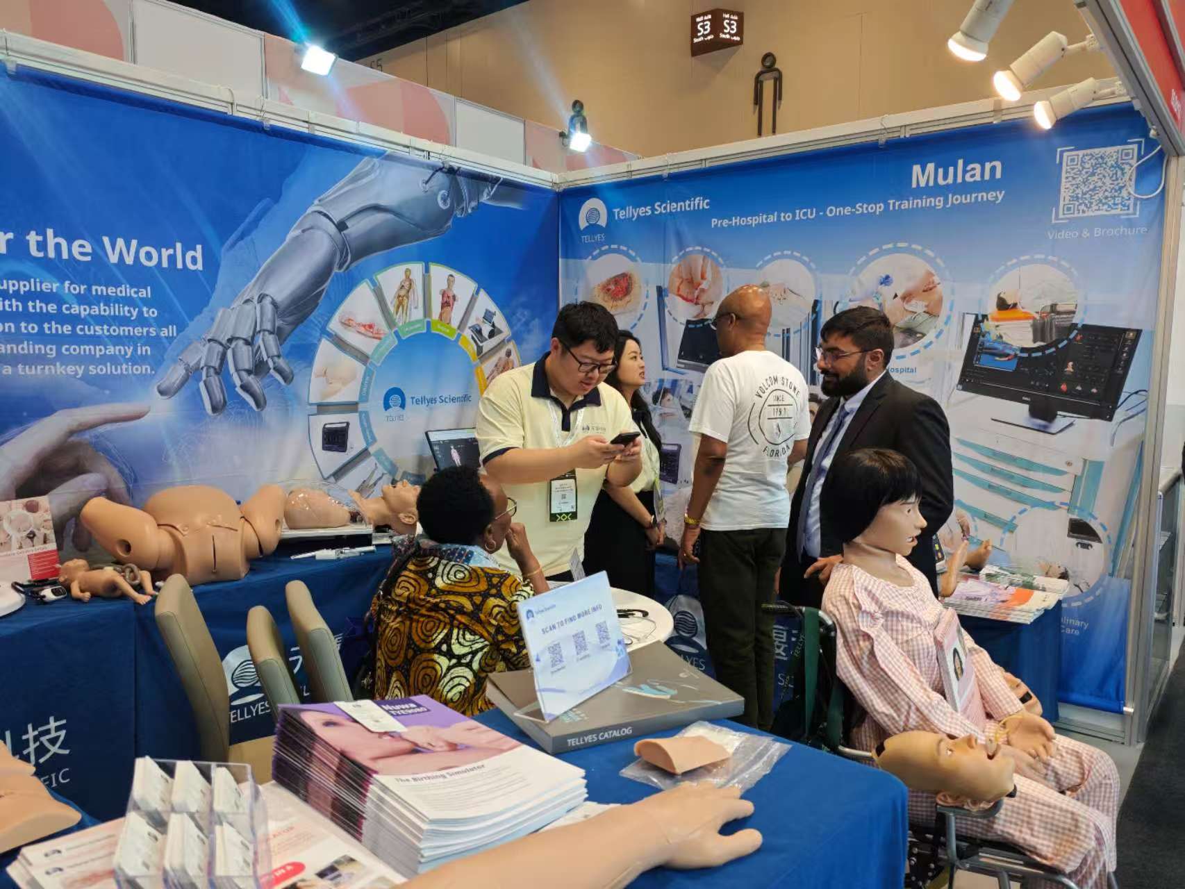 Tellyes team made a splendid appearance at Booth S3.B113, showcasing a range of high-end intelligent simulators including MULAN-Multifunction Patient Simulator, Althea Nursing, SP Brothers-Standardized Patient Brothers, Complete Childbirth Simulator (Twins), and DefibReady. On the very first day, our booth attracted over a hundred experts from more than 40 countries and regions for visits and hands-on experiences.